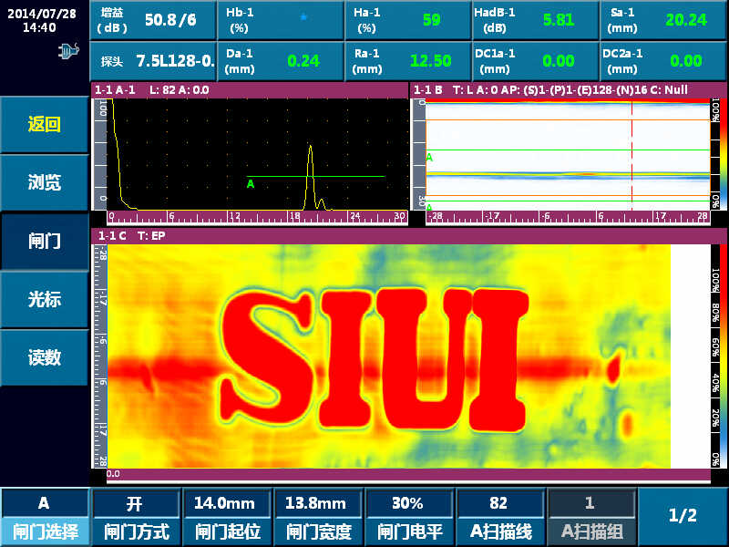 具有C掃功能,能直觀顯示工件內(nèi)部結(jié)構(gòu)??蓪Σ牧险辰訉淤|(zhì)量、管道內(nèi)壁腐蝕等進(jìn)行檢測和分析。下例是在可有SIUI字樣的有機(jī)玻璃試塊上進(jìn)行C掃的效果圖。