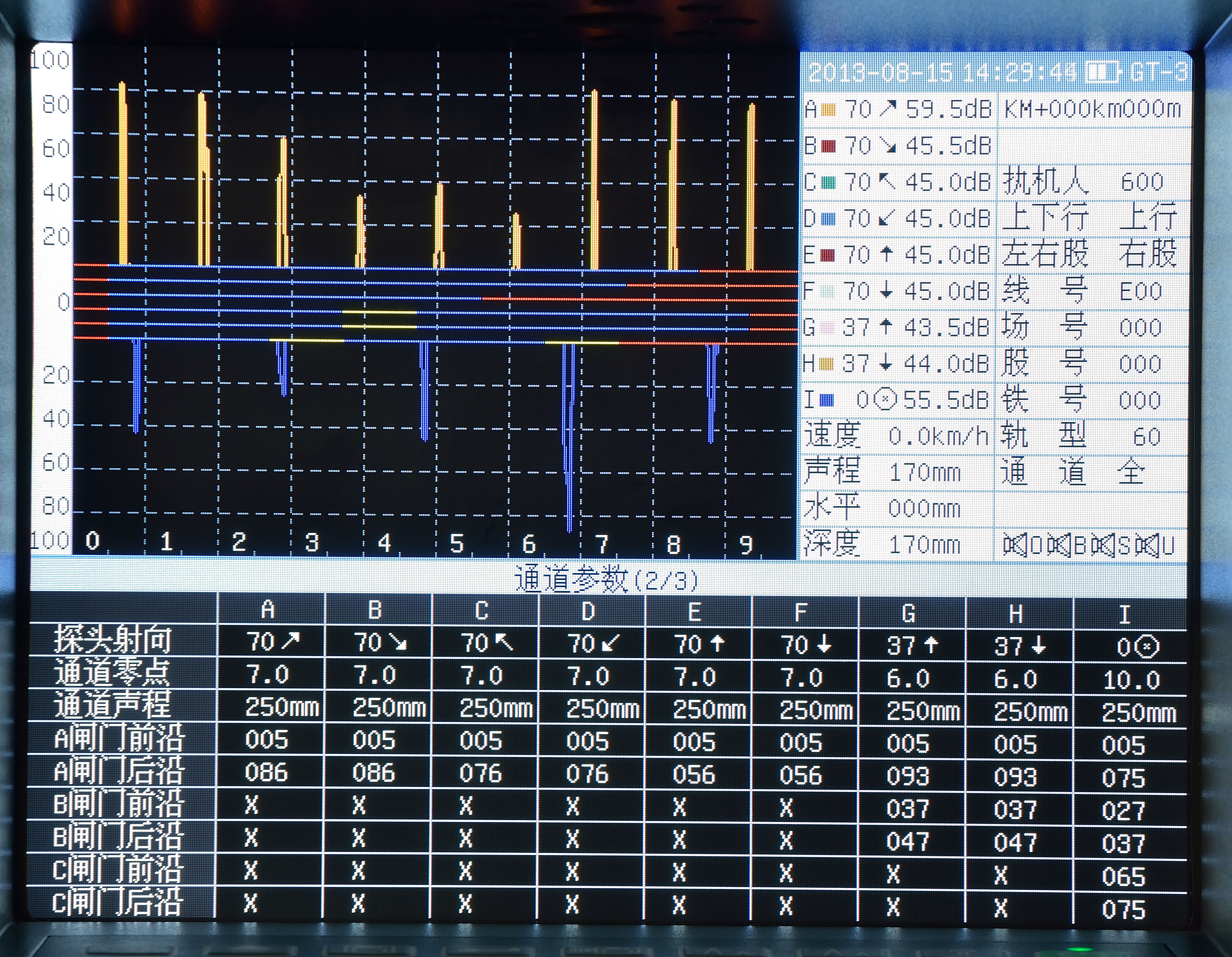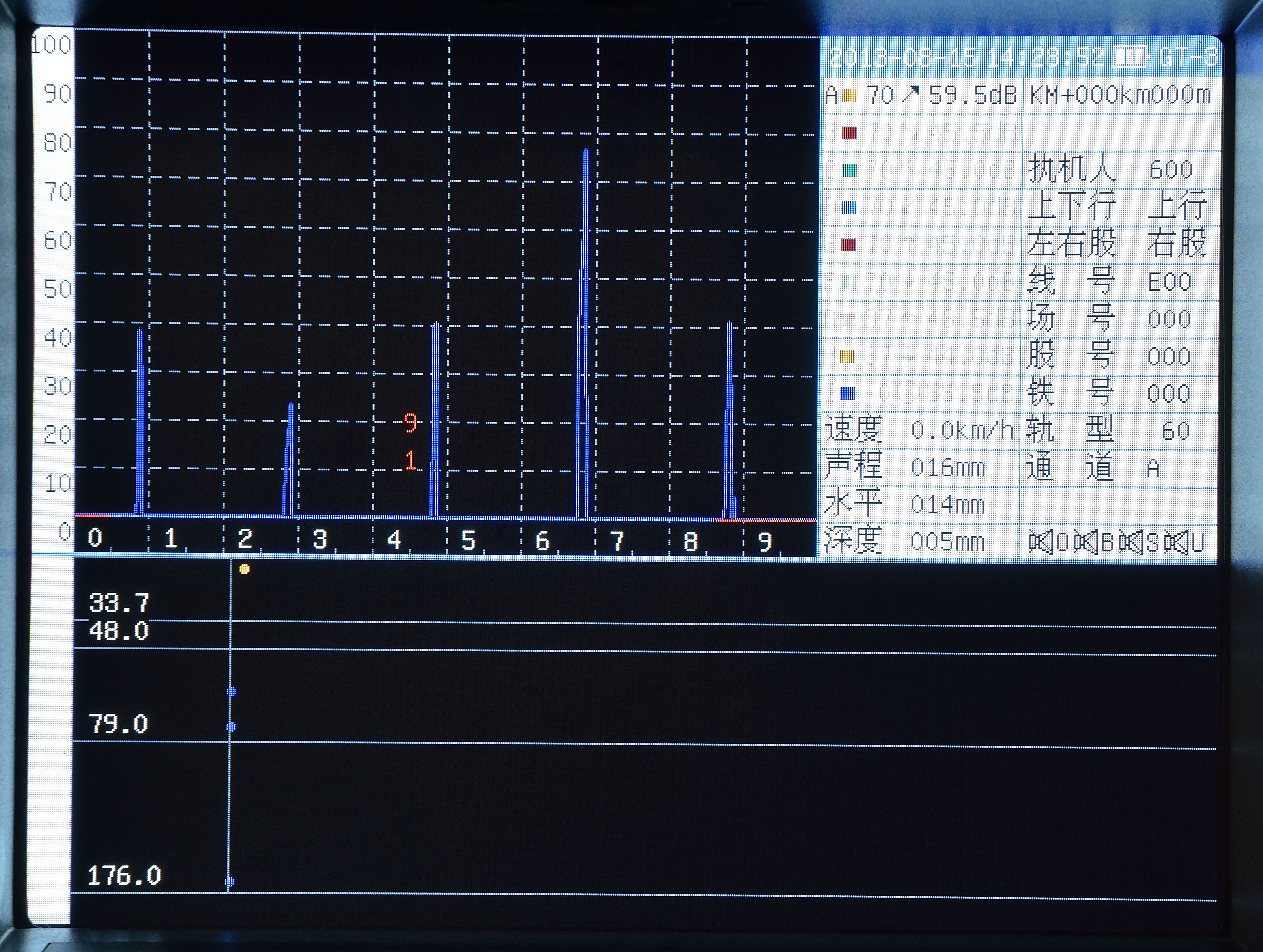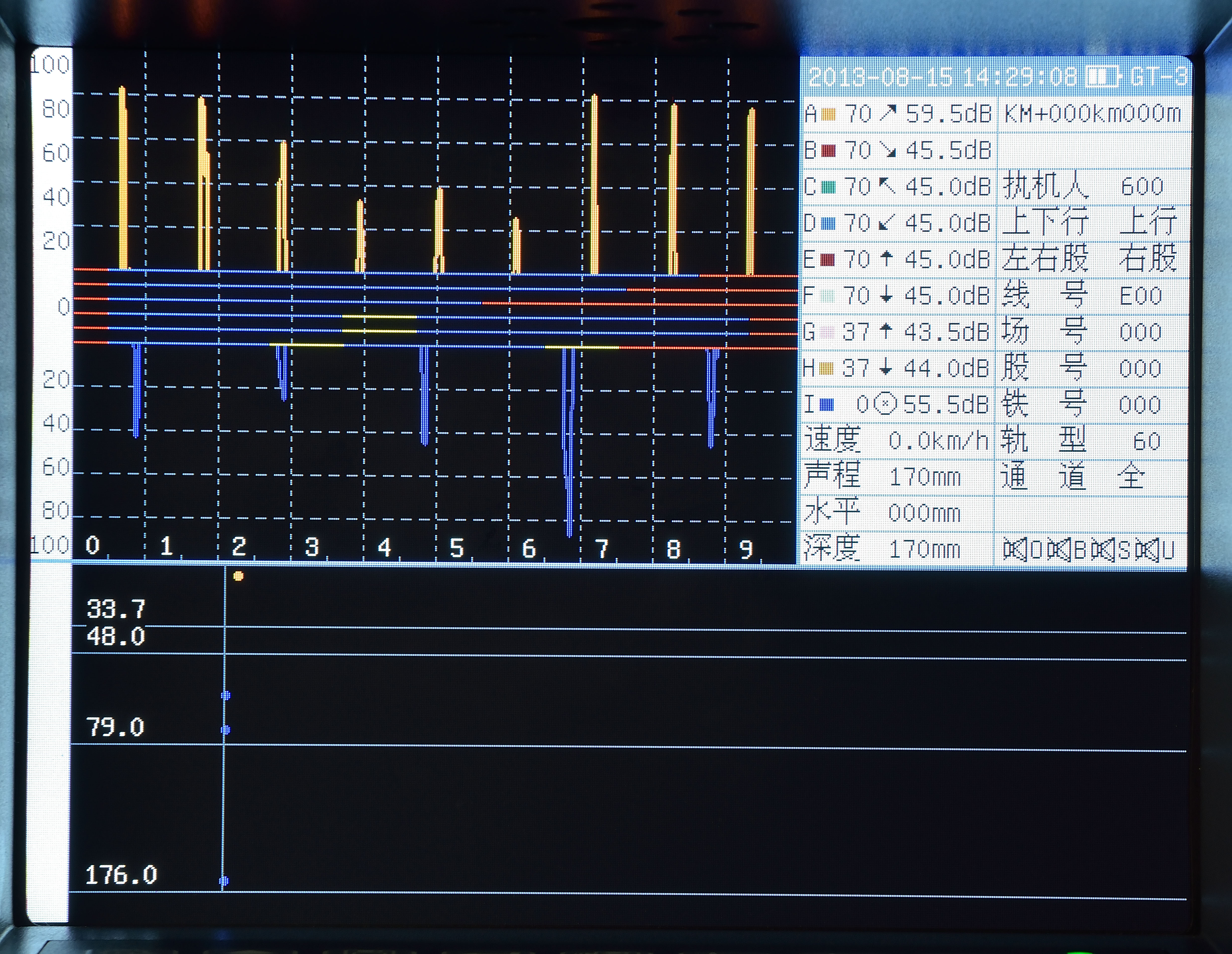 GT-3具有A型和B型掃描,其中B型掃描為鋼軌的側(cè)視圖,可以清晰的分辨缺陷的分布和走向。A型和B型顯示相互輔助,輕松完成鋼軌的超聲檢測。