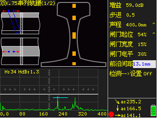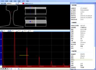 B顯圖:具有焊縫B顯標(biāo)記圖功能,用于在鋼軌焊縫工字型截面圖上對報警信號進(jìn)行分布情況的自動標(biāo)記;檢測過程具有步驟提示示意圖。檢測步驟及結(jié)果一目了然