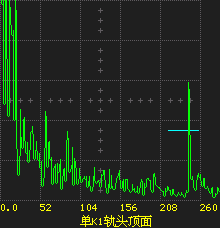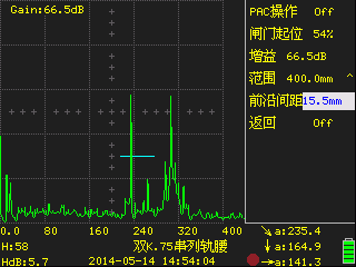 | 使用單K2.5斜探頭,對GHT-5試塊B區(qū)的1~5號橫通孔制作DAC曲線,用一次波從鋼軌踏面和側(cè)面進(jìn)行掃查。圖示為軌頭中缺陷的回波。 | 使用單K1斜探頭,用一次波由鋼軌踏面對軌腰進(jìn)行正反向掃查。圖示為軌底處缺陷的回波。 |