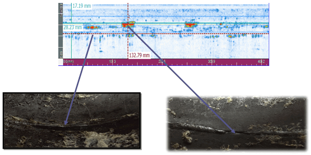 2-28樣管(彎頭)的相控陣圖譜與實物缺陷的具體位置對應(yīng)如下圖所示,下圖顯示為彎頭的點渣及未焊透: