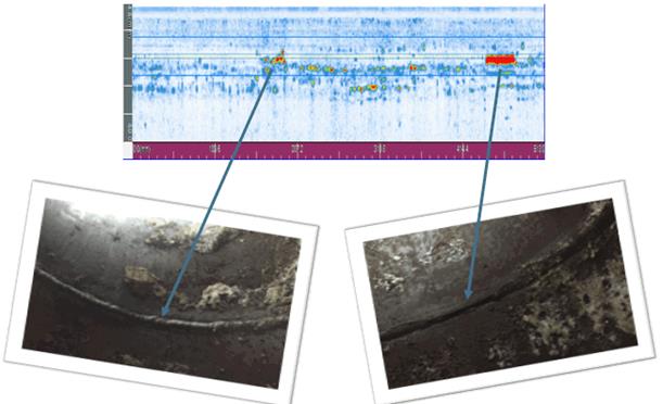 2-25樣管(彎頭)的相控陣圖譜與實物缺陷的具體位置對應(yīng)如下圖所示,下圖顯示為彎頭的點渣及未焊透缺陷: