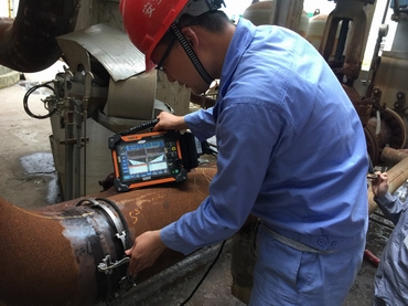 現(xiàn)場檢測彎頭焊縫是利用TSE-01/02掃查器配合SyncScan 16PT相控陣超聲檢測儀,以下是現(xiàn)場檢測的圖片: